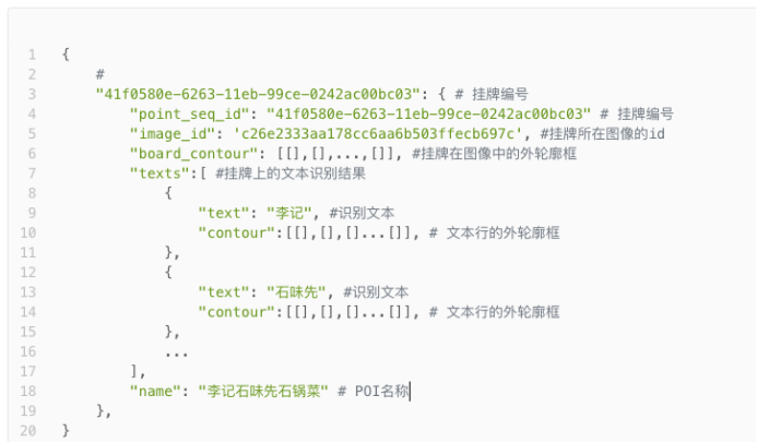 | 最优名称(1分) | 对于 POI挂牌来说最完整且通顺,最能表示POI所有者的取名意图的名称。 | “李记石味先石锅菜”、“谢记原香牛肉馆青白江店” |